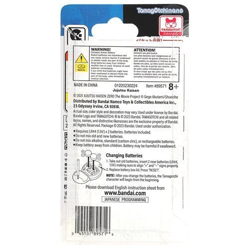 Fight curses and train sorcerers from Jujutsu Kaisen 0: The Movie. This Tamagotchi Nano features a shell designed to look like Gojo's eye wrappings and cursed energy! Feed your character when hungry, give them a snack when they are in a bad mood, and play three different mini-games. Your play pattern will determine which of the 13 characters Satoru Gojo will introduce you to. If you neglect your characters, they will leave. The Jujutsu Kaisen 0 Satoru Gojo Tamagotchi Nano Digital Pet measures about 1 1/2-inches tall x 1 1/5-inches wide x 1-inch long. Requires 2x "LR44" batteries, which come included. Ages 8 and up.