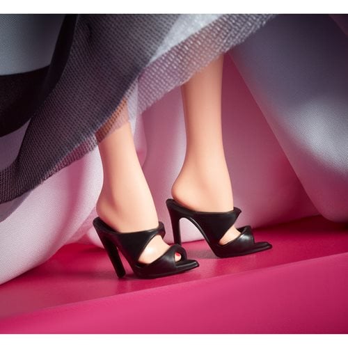 - She wears a black and white gown inspired by the swimsuit that the original Barbie doll wore. A fitted sweetheart bodice blooms into a voluminous striped skirt.